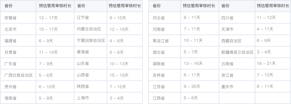 各個(gè)省管局預(yù)計(jì)審核時(shí)長,實(shí)際審核時(shí)長會根據(jù)備案場景有所不同,下表格僅供參考。詳情可查看 詳細(xì)規(guī)則。